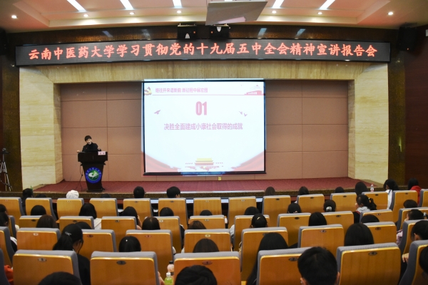 张丽以《继往开来谱新曲 新征程中展宏图》为题,对党的十九届五中全会精神作了全面宣讲和深入阐释。她回顾总结了十三五期间我国决胜全面建成小康社会取得的成就,引出我国即将开启全面建设社会主义现代化国家新征程,分析了我国现阶段面临的机遇与挑战,结合习近平总书记考察云南重要讲话精神和云南省《关于促进中医药传承创新发展的实施意见》,提出要落实好立德树人根本任务,加快医学教育创新发展,为服务健康中国建设作出更大贡献。她勉励同学学习全会精神要往深里走、往实里走、往心里走,坚持做到学深悟透学用结合,落实行动步伐跟进,把学习成效转化为实际行动。