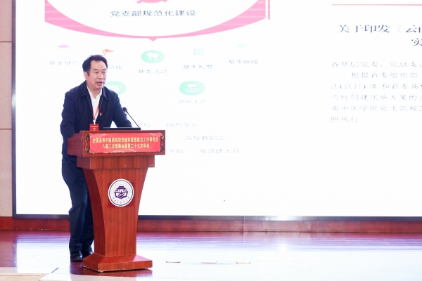经会前审定,16所中医药院校在主题报告论坛上交流。王翠岗书记以《抓实基层党建“六个一”, 为推动高质量发展提供坚强的组织保证》为题作主旨报告。王翠岗说,我校党委始终坚持以习近平新时代中国特色社会主义思想为指导,深入贯彻新时代党的组织路线,通过抓好主线、强化基础、建好队伍、打造特色、达成目标、形成机制等举措,推动学校高质量发展。