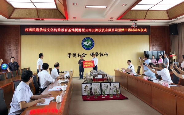 在民进云南省委牵线搭桥下,云南云深投资有限公司将一批价值300万元的中药材植物标本捐赠给云南省中医药民族医药博物馆。据悉,本次捐赠标本共1800多件,包括中药材浸制标本881罐,腊叶标本610副,中药材饮片323罐,以及相应的展柜、标牌、仿古书籍等。博物馆负责人认为,这批植物标本品相好、质量好,具有很高的教学、科普和展览价值。民进云南省委希望学校和博物馆利用好、管理好、养护好这批标本,使其切实助力学校学科建设、人才培养、科普教育和文化传承。