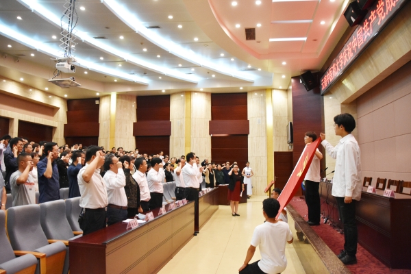 会议在庄严的国歌声中拉开帷幕。校党委书记王翠岗领誓入党誓词,全体参会党员面向党旗庄严宣誓。