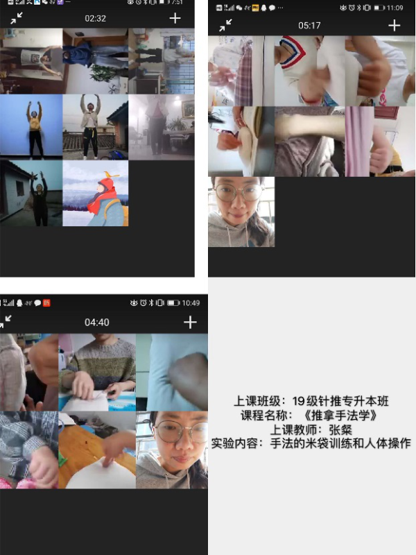 特殊时期,特殊的实训课堂教学方式给老师和学生都提出了挑战,在全院师生的共同努力下,针灸推康复学院积极开拓网络教学新思路,保证了学生的学习质量,提高了学生的自主动手能力,同时也更好的激发了学生的学习兴趣,达到了预期教学效果,圆满完成了预定教学任务,也为今后丰富实践实训课程教学内容和方式积累了经验。