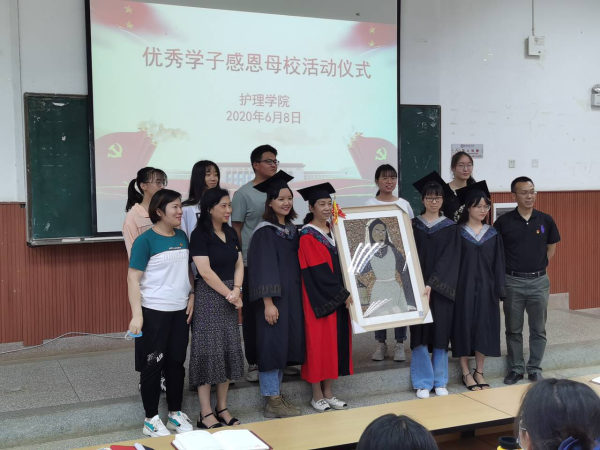 云中讯(通讯员 李艳慈 林丹 田桂兰)2020年6月8日,护理学院优秀学子创办的非遗刀画协会将制作的“提灯女神——南丁格尔中药贴画作品”赠与学院,护理学院在1111教室举行了接收纪念仪式,该仪式由护理党委书记、院长毕怀梅主持,护理学院全体教职工参加活动。