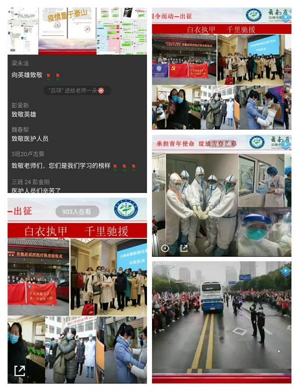 17级护理1班刘丕龙 : 2020年除夕夜,网上各种平台报道云南省医疗队驰援湖北的英勇事迹,我感到特别的骄傲与自豪,因为他们都是我们的老师,是我们的前辈,是我们的榜样。他们都经历过2003年的非典,此次疫情更甚当年,他们明明知道疫情前线意味着什么,明明知道可能会有去无回,可是他们没有犹豫,没有退缩,毅然决然奔赴生死前线。他们是父母的子女,是子女的父母,是一个家庭的中坚力量,但是在祖国需要他们的时候,他们选择了舍小家为大家。听他们分享战役的艰苦和战役中的所见所闻所感,我们都被他们的行为深深震撼,心里的那种感动感慨感触真的无法用语言形容。他们挺过了抗疫斗争最艰难的时期,他们帮助了很多患病同胞度过最危急的关头,他们热心陪伴在患者身边,他们是最勇敢的人,是最坚强的人,是最可爱的人,是最值得敬佩的人,他们是天使,是英雄,是我们的榜样,向最美的天使们学习,向抗疫英雄们致敬!