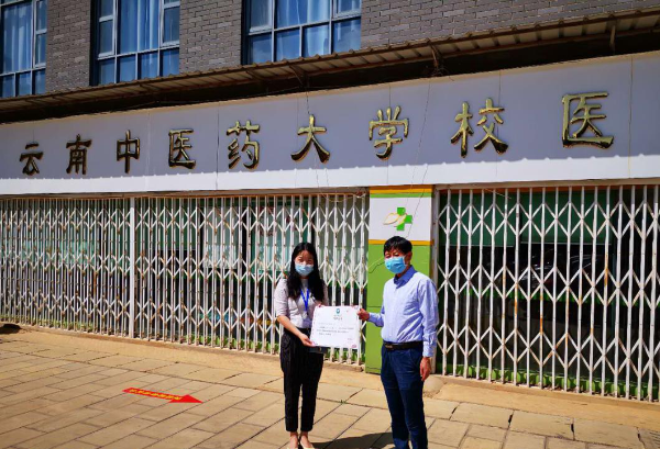 云中讯(研究生处)2020年5月6日云南道地药业(集团)有限公司董事长关友、销售部总监杨兴良一行代表公司向我校捐赠了价值十万元的中药饮片及84消毒液。昆明赛诺制药股份有限公司人力资源部经理孔佑聪、宣传专员孙海迪一行代表公司向我校捐赠了1万个一次性医用防护口罩。