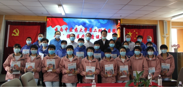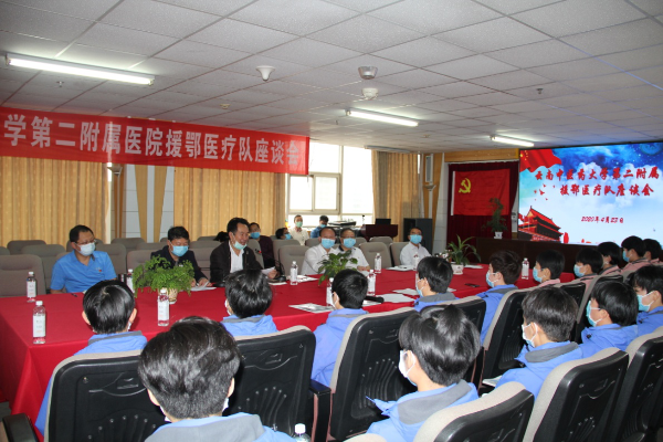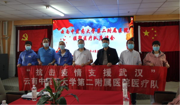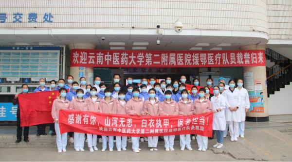 云南省派出医疗队驰援湖北抗疫期间,附二院22名医护人员被编入云南省第四批和第五批援助湖省医疗队,于2月15和16日从昆明出发奔赴荆楚大地,进驻武汉市汉阳体校方舱医院和优抚医院开展医疗救护工作。队员们严把诊疗质量关,施行中西医结合治疗,并辅助心理干预治疗,全心全意诊治每位患者,严格感控杜绝医疗队员职业暴露隐患,与其他医护人员团结一致、高效协作,最终以“出院患者零复阳、医疗护理零差错、医护人员零感染”的佳绩圆满完成战疫任务,分别于3月18日和22日回到昆明。