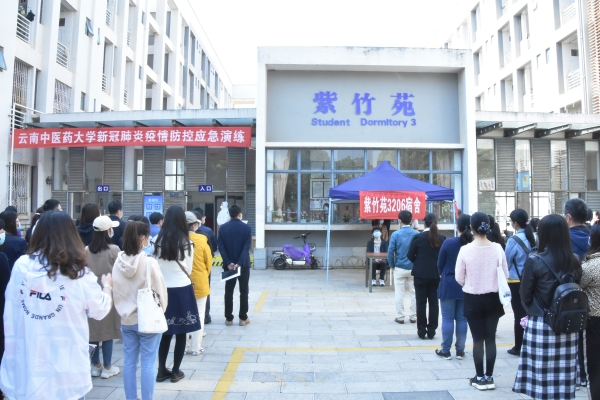 为增强实战效果,培训结束后立刻举行了突发疑似新冠肺炎疫情的现场演练。此次实战演练严格按照《云南中医药大学新冠肺炎疫情防控联合演练方案》执行,模拟了学生返校体温异常、班主任信息上报、学生校医院就诊、校医院初步核实转诊、上报疫情、启动隔离与消杀、排查密切接触者、学生宿舍警戒与封闭管理等流程。整个演练过程紧张有序,各个环节配合密切,生动真实。