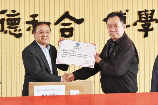 捐赠仪式上,曲靖格力康生物科技公司向学校提供价值12万元金香清瘟合剂13件共2028瓶,以及金荞麦饮片1000公斤。袁建平代表曲靖格力康生物科技公司向学校捐赠物资,王翠岗代表学校向捐赠方颁发捐赠证书。