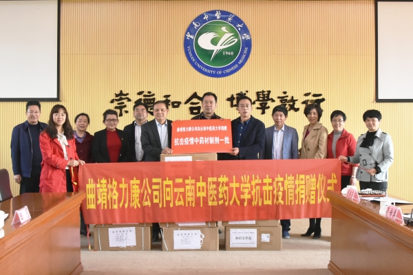 云中讯(新闻中心)3月25日下午,曲靖格力康生物科技公司向学校捐赠抗击新冠肺炎疫情中药材制剂捐赠仪式在呈贡校区举行。
