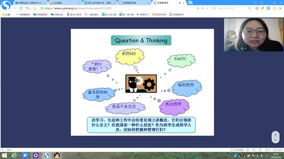 在专业课教学中引入思政元素也是中药学院线上课堂的重点。这些思政元素的加入不仅进一步引导学生坚定“四个自信”,培育学生的爱国情怀,对授课教师也是一种精神的洗礼和思想的升华。药剂教研室等多个教研室老师在授课中引入“疫情防控思政元素”,如讲解中通过对比不同年代法律中“药品”“新药”“仿制药”的定义,培育学生兼有家国情怀与国际视野、传统精神与现代意识;从防控食源性疾病角度分析,从2003年的“非典”和2020的“新冠”爆发,都和吃分不开,引导学生从现在做起,从自身做起,呼吁大家尊重自然,敬畏生命,善待野生动物,别让舌尖上的疫情重演;法匹拉韦和瑞德西韦的介绍让同学们在认识到抗病毒药物研发艰难的同时,深深感受到此次疫情中党和国家为人民做出的贡献,以及中国领导和中国特色社会主义制度的显著优势。