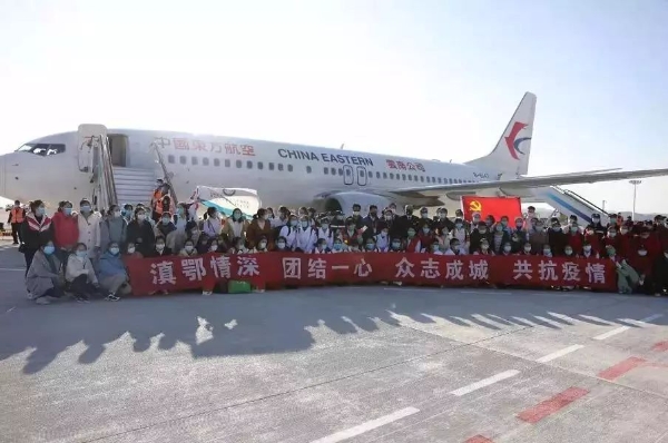 据悉,2月4日17时40分,东航云南MU2000航班搭载着云南省第二批护理医疗队102名医疗人员和3.1吨物资,从长水机场腾空而起飞往武汉。19时12分,航班平稳降落在武汉天河机场,乘务组与白衣天使们依依惜别,并为逆行的英雄们送上准备好的干粮餐袋,希望在战“疫”凯旋时,再接英雄们回家。