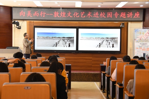 王东介绍了敦煌莫高窟的历史发展,并通过图片展示了莫高窟精美绝伦的壁画及书法名作,用生动的故事,讲述了一代代“莫高人”薪火相传坚守大漠、甘于奉献、勇于担当、开拓进取的“莫高精神”。