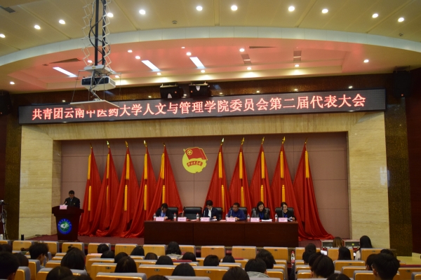 在雄壮的国歌声中,大会拉开了帷幕。本次会议主要是听取和审议上一届团委和学生会工作报告,选举产生第二届共青团云南中医药大学人文与管理学院委员会和第二届学生委员会。