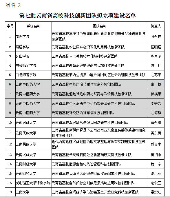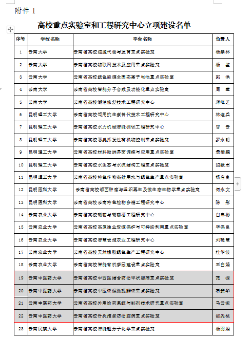 云中讯(通讯员 李莉 解娅)近日,云南省教育厅批准立项建设第七批省高校重点实验室36个、省高校工程研究中心20个和省高校科技创新团队42支,其中我校共获立项建设省高校重点实验室4个,分别是范源教授负责的“云南省高校中西医结合防治甲状腺病重点实验室”、石安华副教授负责的“云南省高校中医证候微观辩证重点实验室”、马云淑教授负责的“云南省高校外用给药系统与制剂技术研究重点实验室”、邰先桃教授负责的“云南省高校针灸推拿防治脑病重点实验室”。省高校科技创新团队4支,分别是俞捷教授牵头的“云南省高校中医药防治代谢性疾病科技创新团队”、徐福荣教授牵头的“云南省高校道地濒危中药材繁育与栽培科技创新团队”、李秀芳教授牵头的“云南省高校中医治法与中药药效关系研究科技创新团队”、刘海静教授牵头的“云南省高校针灸防治神志病科技创新团队”。