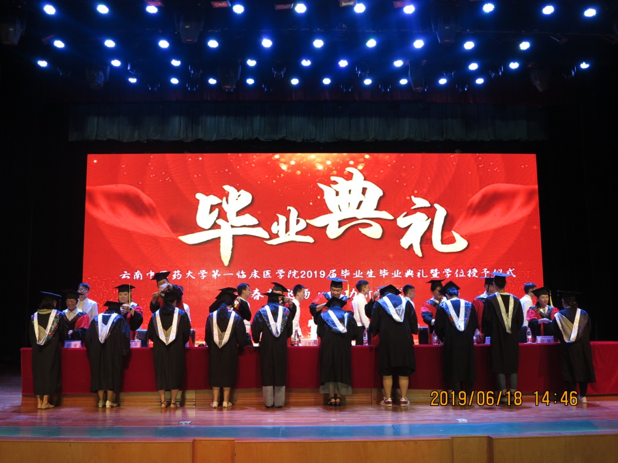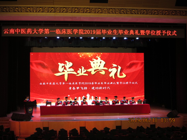 云中讯(通讯员 杨玉庭) 6月18日下午,第一临床医学院2019届毕业生毕业典礼暨学位授予仪式在呈贡校区兰茂堂隆重举行。校党委书记王翠岗、基础医学院党委书记卞瑶、教务处副处长俞捷、研究生处副处长罗兵、学生处副处长杨萍应邀出席典礼。第一附属医院院长温伟波、党委副书记徐莉娅、副院长赵荣、纪委书记戴振杰、副院长顾海潮,全体辅导员及921名毕业生参加了毕业典礼暨学位授予仪式。典礼由副院长赵荣主持。