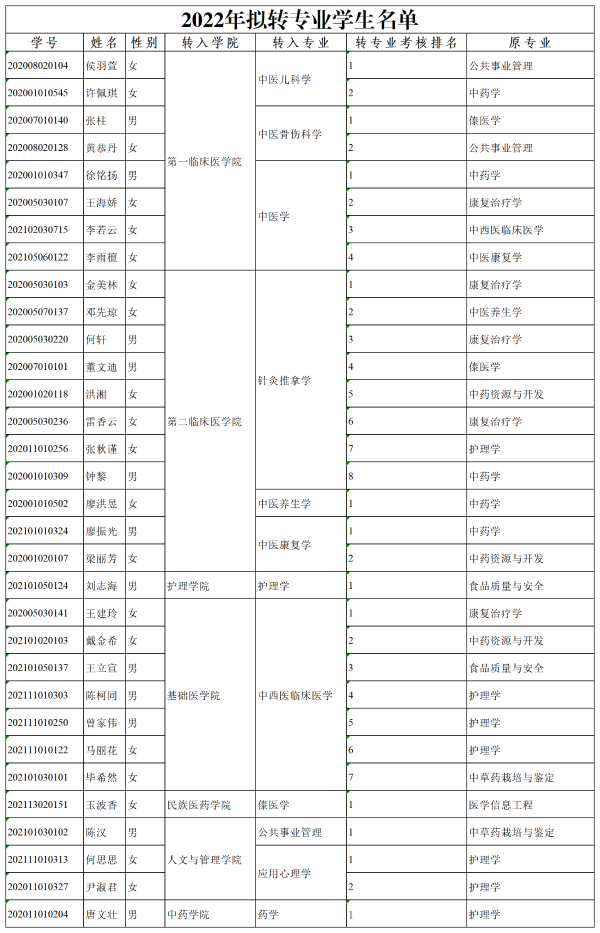 根据《云南中医药大学全日制本科生转专业管理办法(试行)》(云中校教字〔2020〕18号)规定,各相关学院按照工作方案已组织完成考核,经公示无异议并提出意见的基础上,学校转专业工作领导小组审核同意,现对拟转专业学生名单进行公示。