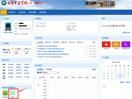 1、登录云南中医学院数字校园统一信息门户,点击右上角的“云自助”进入学生自助业务系统。