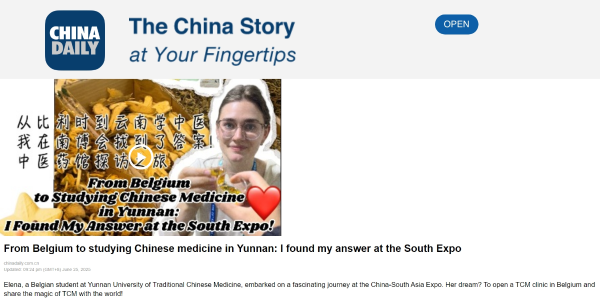 中国日报:From Belgium to studying Chinese medicine in Yunnan: I found my answer at the South Expo(《比利时女孩逛南博会:在传统与创新中触摸中医魅力》)