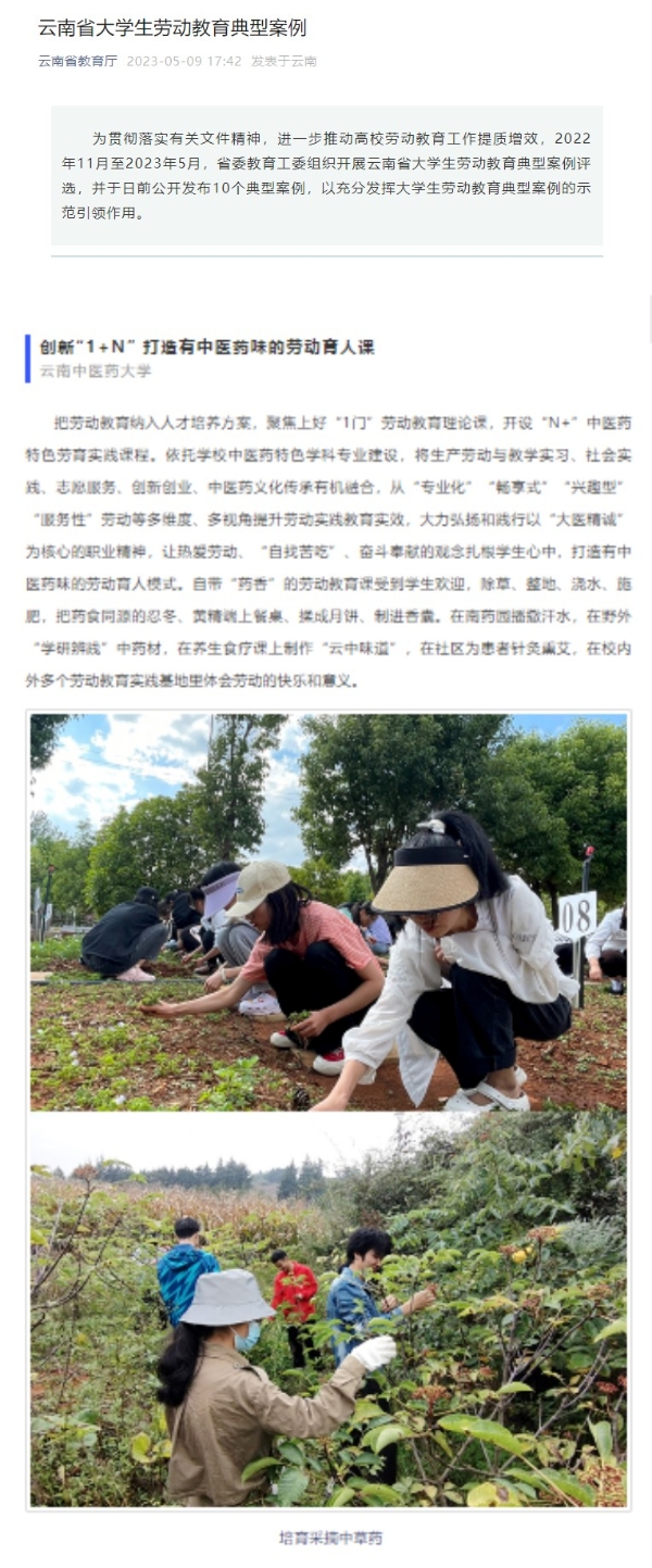 编者按:近日,省委教育工委组织开展云南省大学生劳动教育典型案例评选,并于日前公开发布10个典型案例,我校案例“创新'1+N' 打造有中医药味的劳动育人课”入选。云南日报专题文章“劳动教育滋养云岭‘花朵’”提到了我校自带药香的劳动教育课,请大家关注。