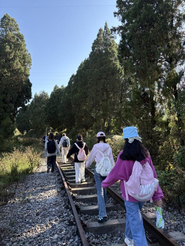 清晨八点半,同学们在呈贡校区和合楼前整装集结,统一乘车前往起点可保村火车站。抵达后,带队老师为大家深情讲述了滇越铁路的沧桑历史——从筑路劳工的血泪艰辛,到抗战时期铁路所承载的民族使命。一段段往事,一幕幕记忆,让同学们还未启程,已对这条“活的历史长廊”充满敬畏。