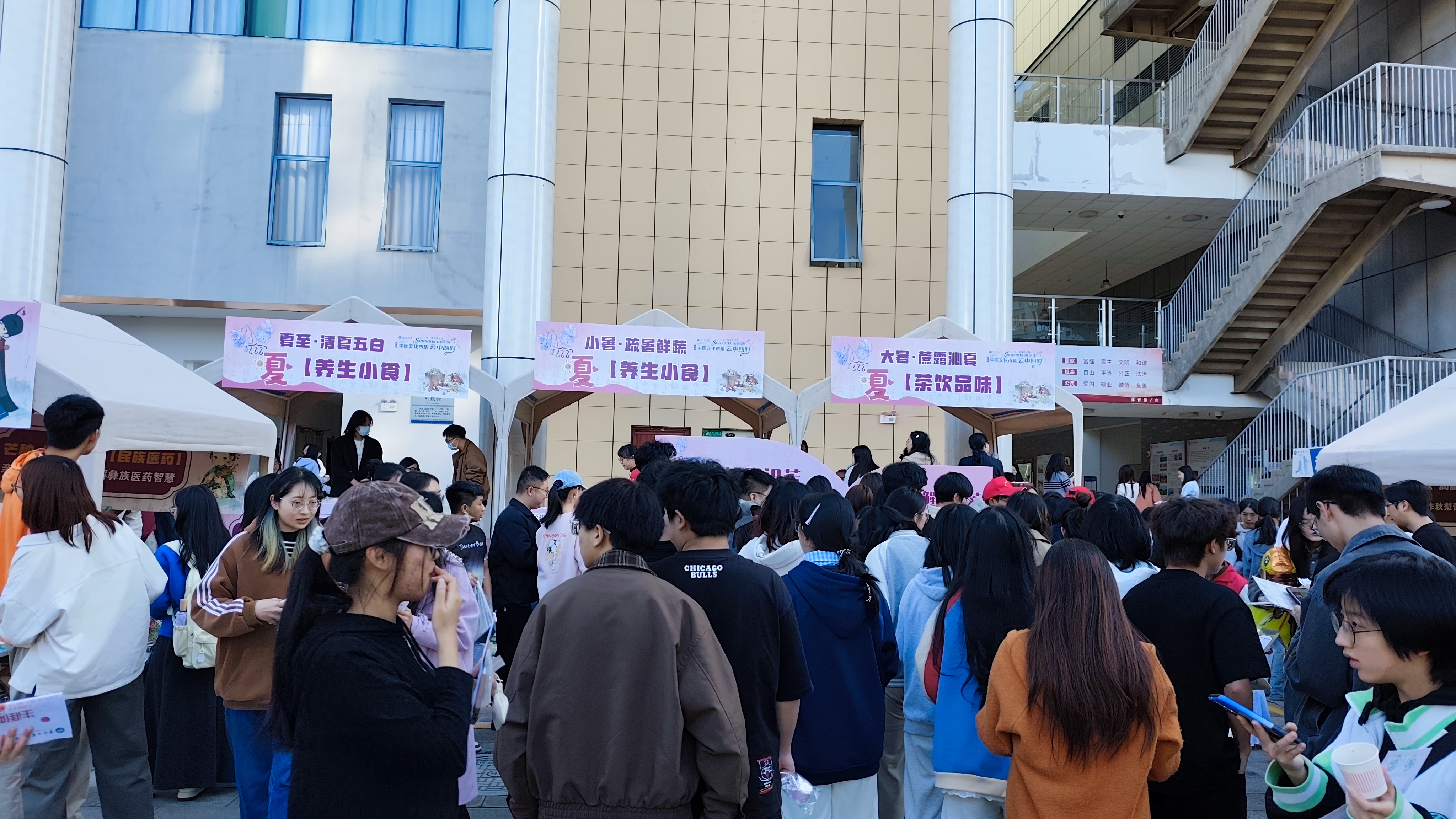 活动核心区“云中四时市集”按照春生、夏长、秋收、冬藏四季脉络划分为四大主题展区,每个区域紧扣对应季节的节气养生要义,让中医文化可触、可感、可学。春生区聚焦“春季养肝、启运生机”,策划了疏肝香囊 DIY、草药扎染、谷雨方剂投掷游戏等特色项目,搭配洛神花茶、东风解郁酥等应季药食,让师生从触觉、嗅觉、味觉等多维度感受中医“春宜疏肝”的养生智慧与民俗文化的碰撞交融。夏长区紧扣“夏季养心、清热祛湿”主线,推出中药醒神锤DIY、解暑草药嗅闻猜谜、彝族紫草膏熬制等实践活动,辅以清夏五白饼干、轻炸时蔬荟萃薄荷、蔗露茶饮等清爽美食,使参与者在清凉体验中掌握夏季防暑的实用技巧,领略民族医药的独特魅力。秋收区围绕“秋季养肺、平补肝肾”旨要,设置古法秋梨膏棒棒糖制作、纳西族黑芝麻丸DIY、秋分抛接气球答题等互动环节,搭配银耳雪梨汤、“玄芝黄金盏”茶点等温润药膳,让师生在味蕾与趣味互动中,感知中医养生与民族饮食文化的深厚底蕴。冬藏区以“冬季养肾、固本藏精”为理念,融合功法锻炼与非遗传承,开展八段锦习练、冬藏灯谜竞猜、苗药暖身包制作等活动,搭配瑞雪八珍酥、桂枣养生茶等温补小食,从功法操练到暖身滋养,全方位展现中医“冬宜藏精”的养生之道与民族文化的互融互鉴。